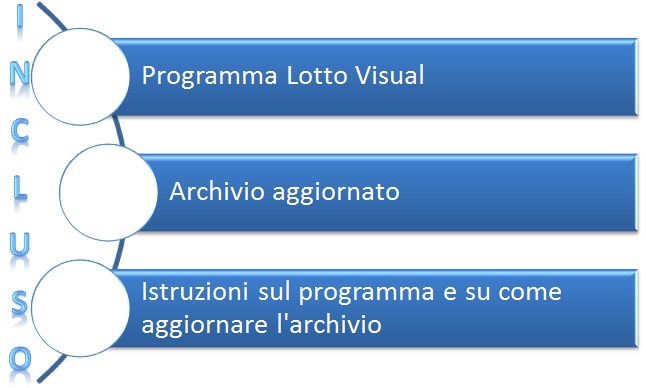 · un archivio di tutte le estrazioni dal 07/01/1939 fino ai giorni nostri, modo per aggiornarlo e per visualizzarlo attraverso il programma principale che è: · Lotto Visual sarebbe uno speciale Tabellone Analitico per visualizzare e studiare accuratamente i numeri e capirne i segreti. Infatti son evidenziati di colore giallo i 5 numeri usciti dell’estrazione successiva in quella precedente Può interessare a tutti i giocatori del Lotto anche per dilettanti